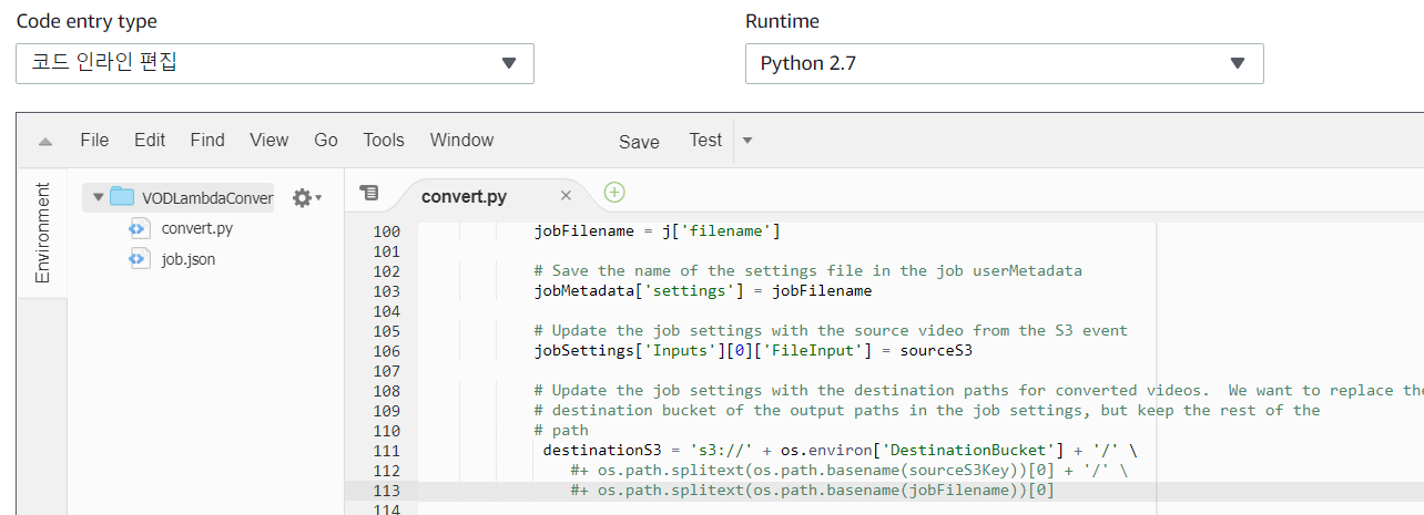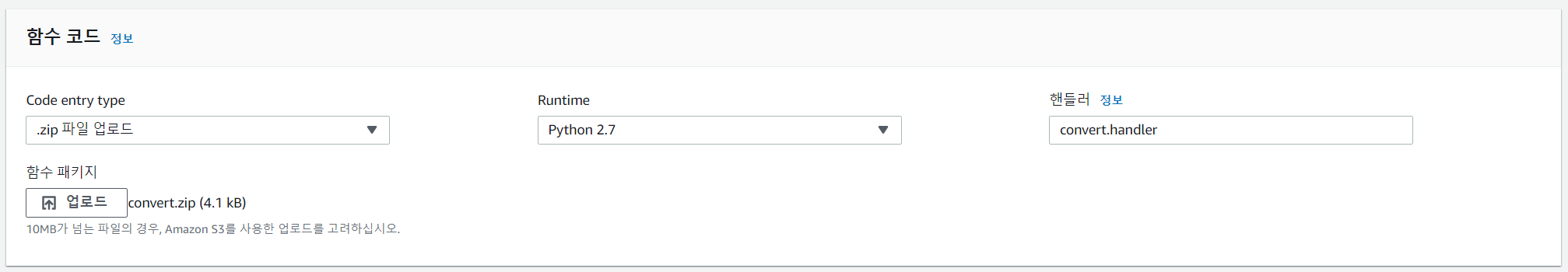- 함수 코드 .zip 파일 업로드 변경 및 zip파일 업로드 후 핸들러 명을 convert.handler로 수정