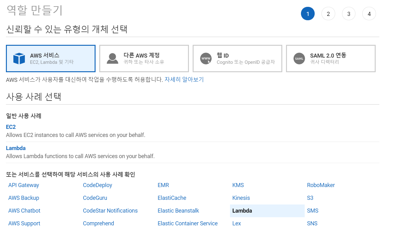 * 람다 함수 관련한 역할 및 정책을 신규 생성합니다.