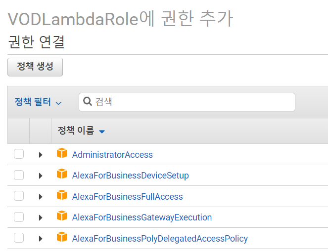 - 생성한 "VODLambdaRole" 검색 및 클릭 후 정책 연결 클릭