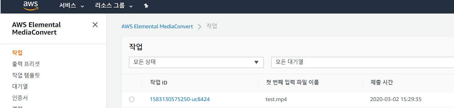 - MediaConvert 서비스 이동 후 작업에 해당 파일 처리 확인