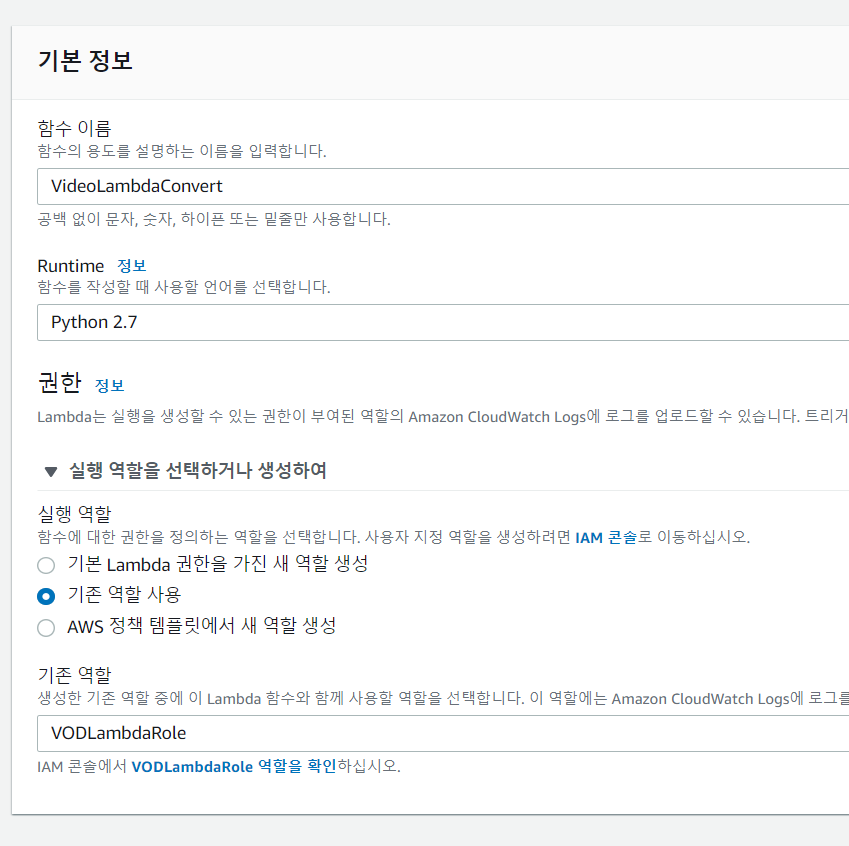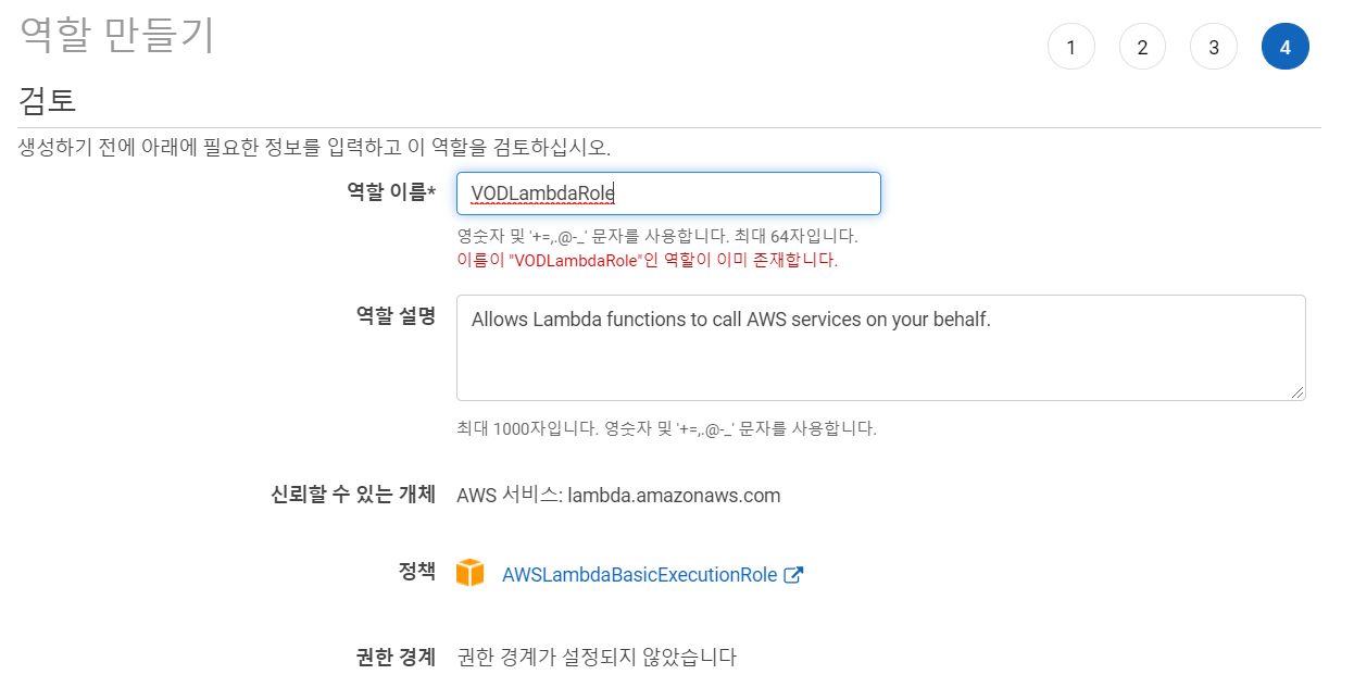 - 역할 이름을 "VODLambdaRole"로 정의 후 생성합니다.