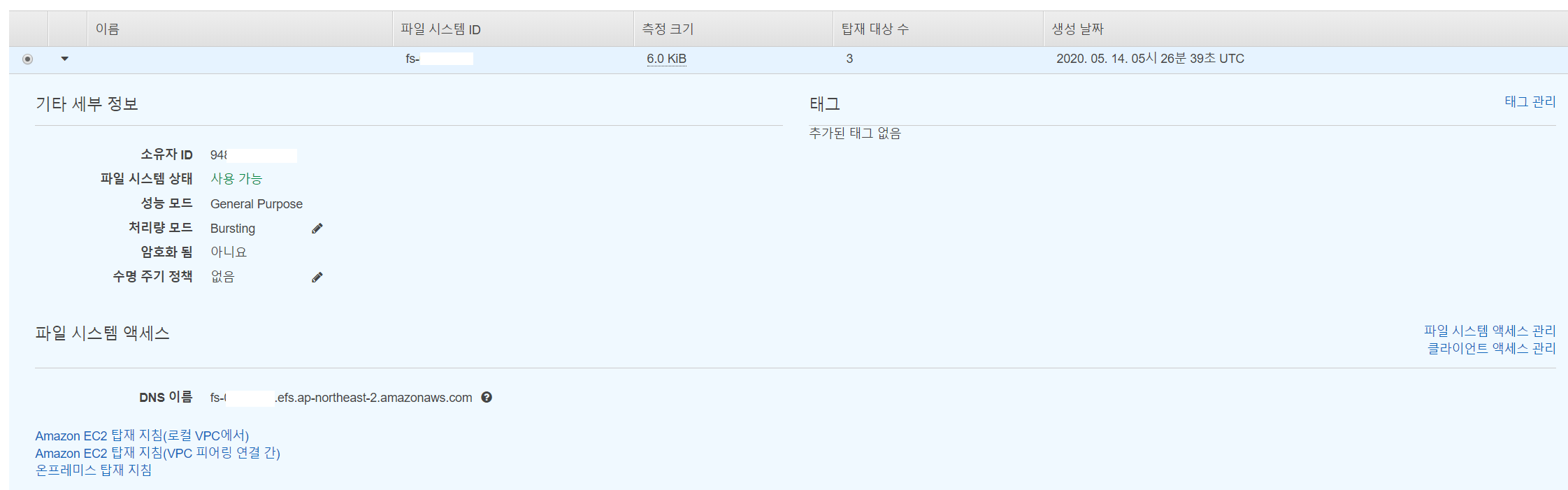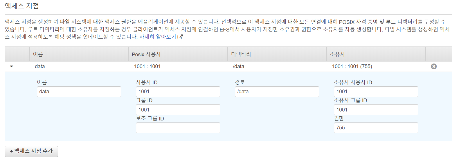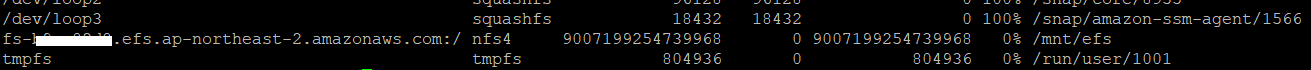 파일시스템ID.efs.ap-northeast-2.amazonaws.com:/ 마운트경로 nfs4 nfsvers=4.1,rsize=1048576,wsize=1048576,hard,timeo=600,retrans=2,noresvport,_netdev 0 0