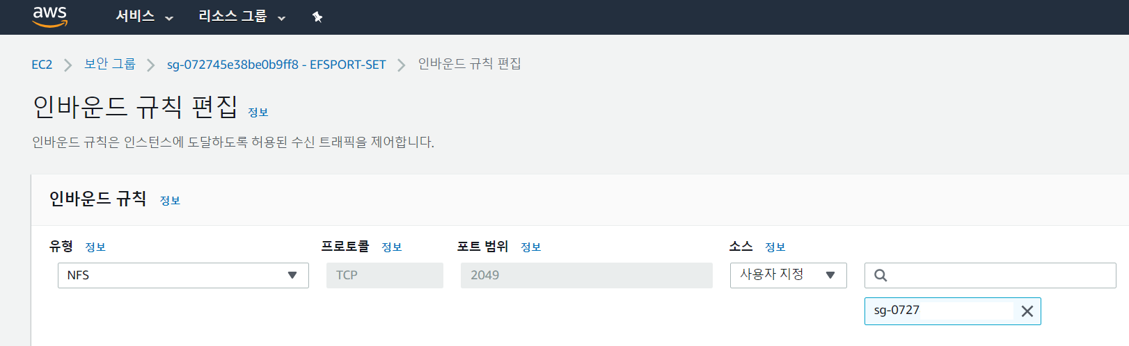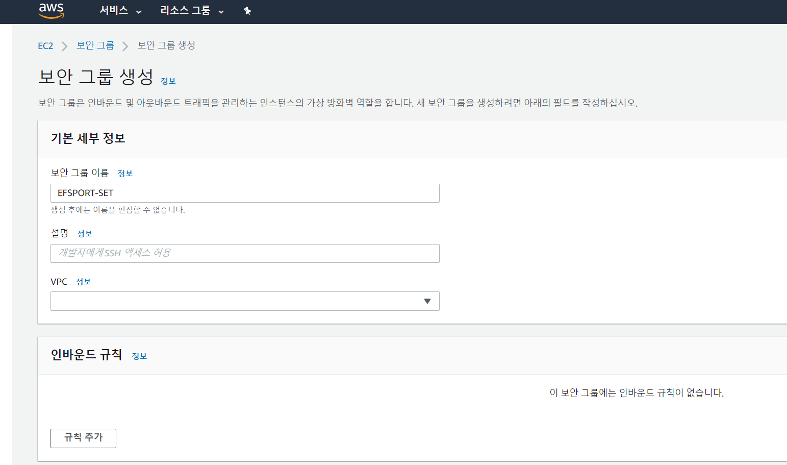- 보안그룹이름은 식별 가능한 이름으로 정함 (저의 경우 EFSPORT-SET)
