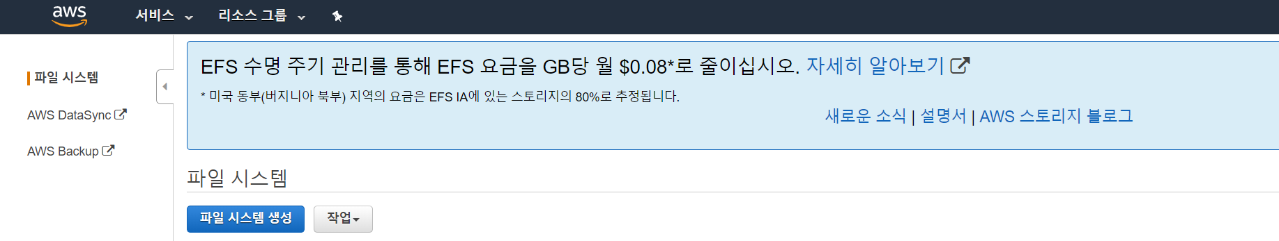 3. EFS 서비스 접속 -> 파일 시스템 생성