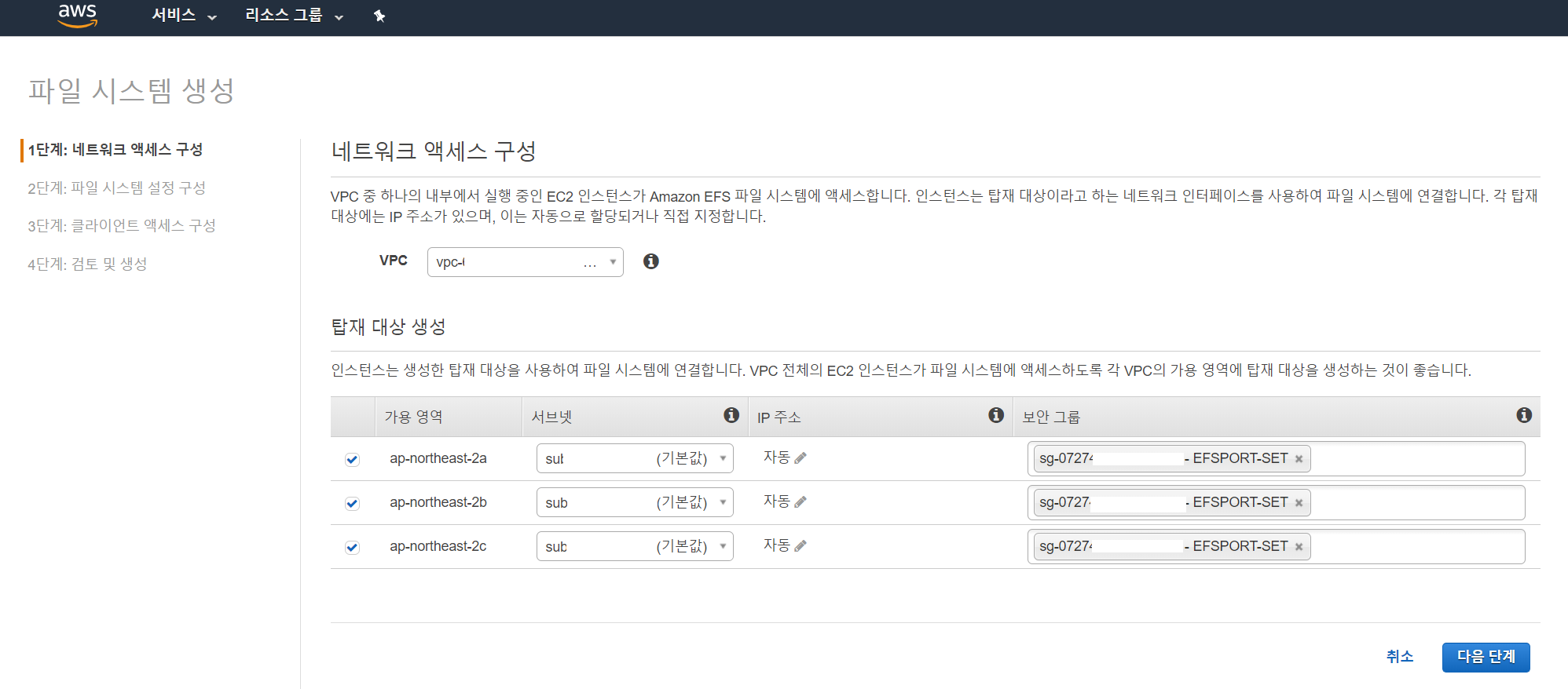 7. EC2 -> 인스턴스 -> 인스턴스 클릭 -> 작업 -> 네트워킹 -> 보안그룹변경 -> EFS 관련 보안그룹 추가